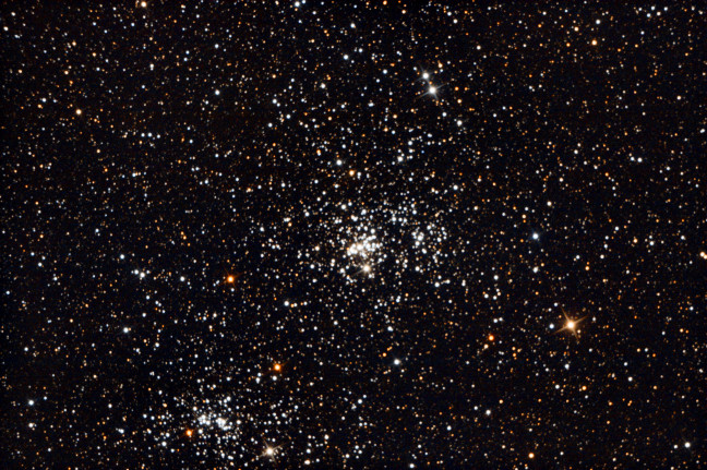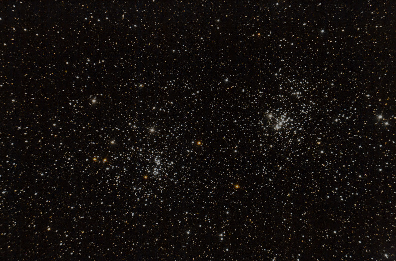 L'autre moitié du Double Amas, lui aussi aisément visible à l'oeil nu. Un peu moins dense mais magnifique également. Contient plusieurs supergéantes rouges dont la couleur est perceptible dans un télescope de 200 mm.