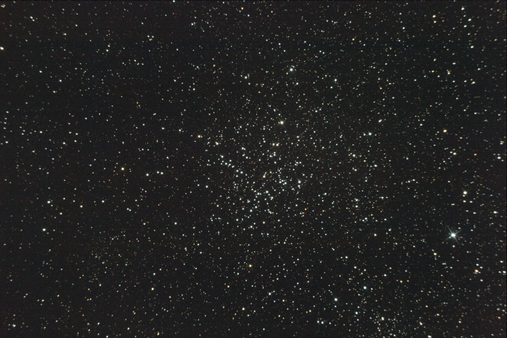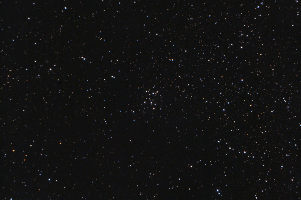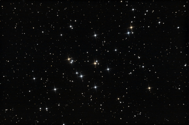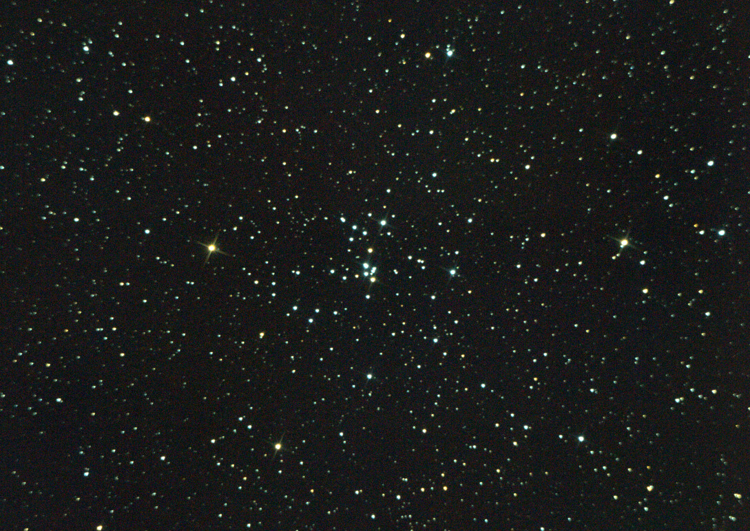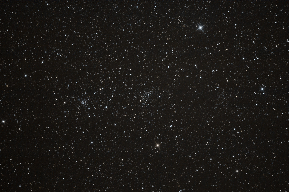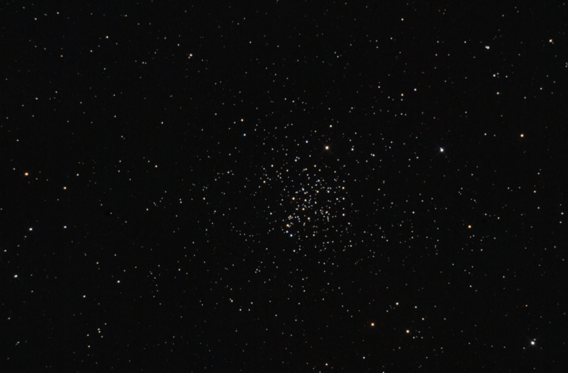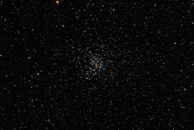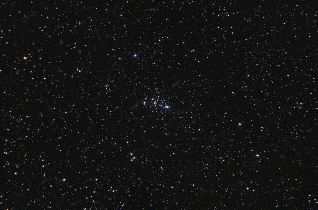 Très bel amas ouvert, pour moi le plus beau de la constellation avec M50. Ses étoiles principales dessinent trois chaînes d'étoiles qui se rejoignent au centre, la zone dense de l'amas, où trône un couple (HJ 740) présentant un joli contraste de couleur (white + bleue).