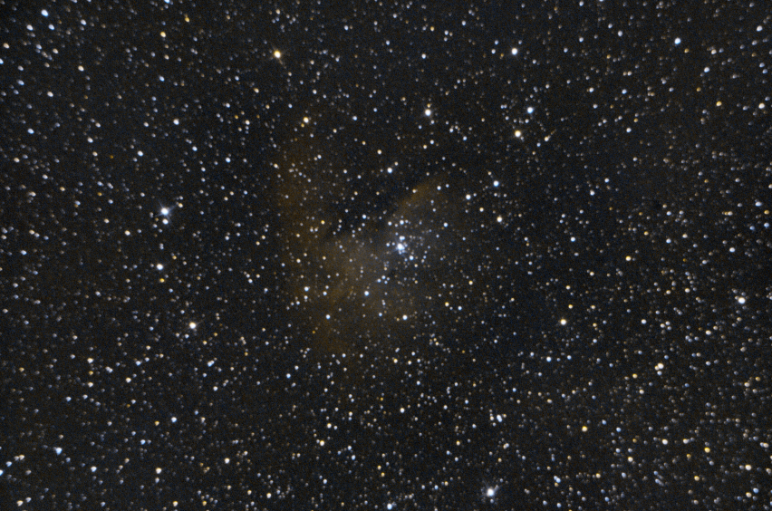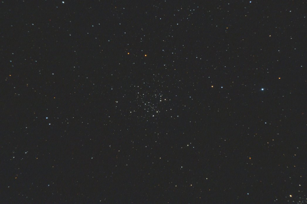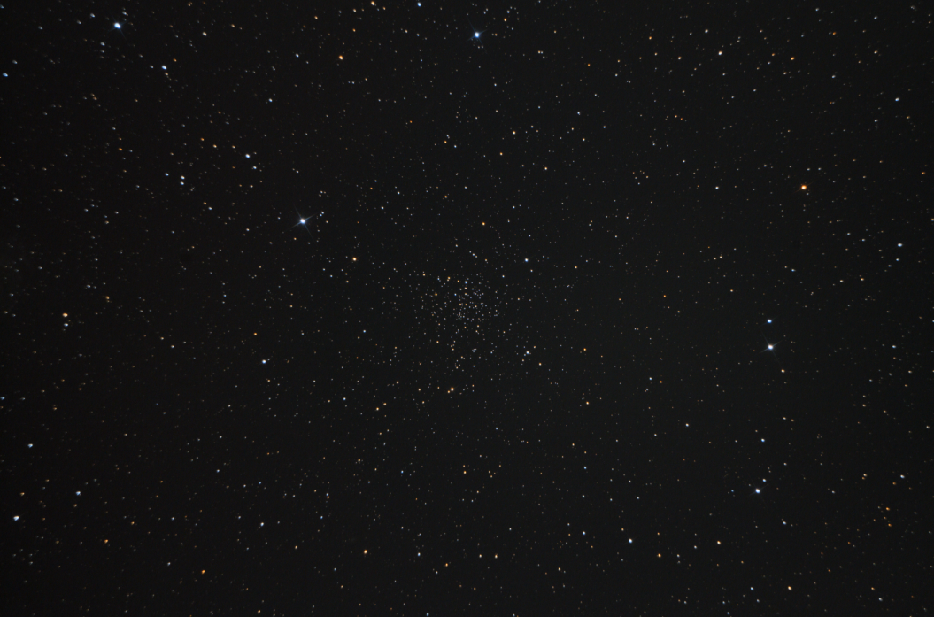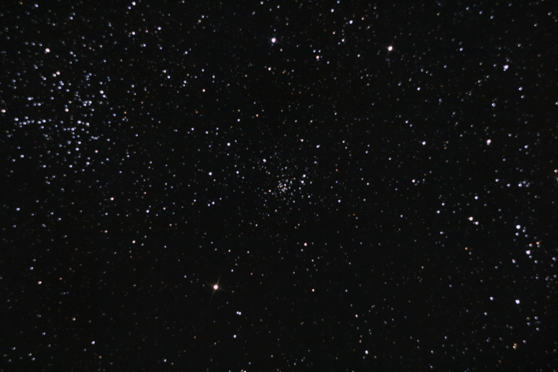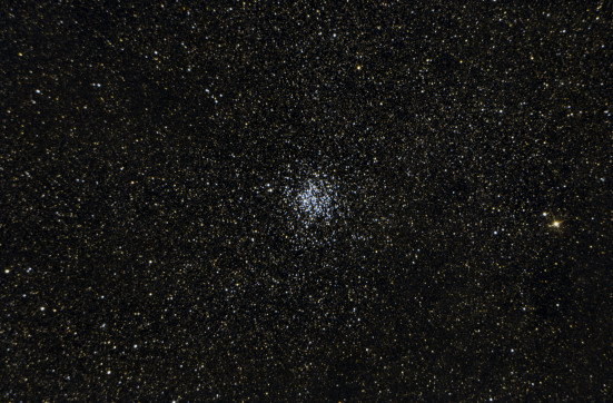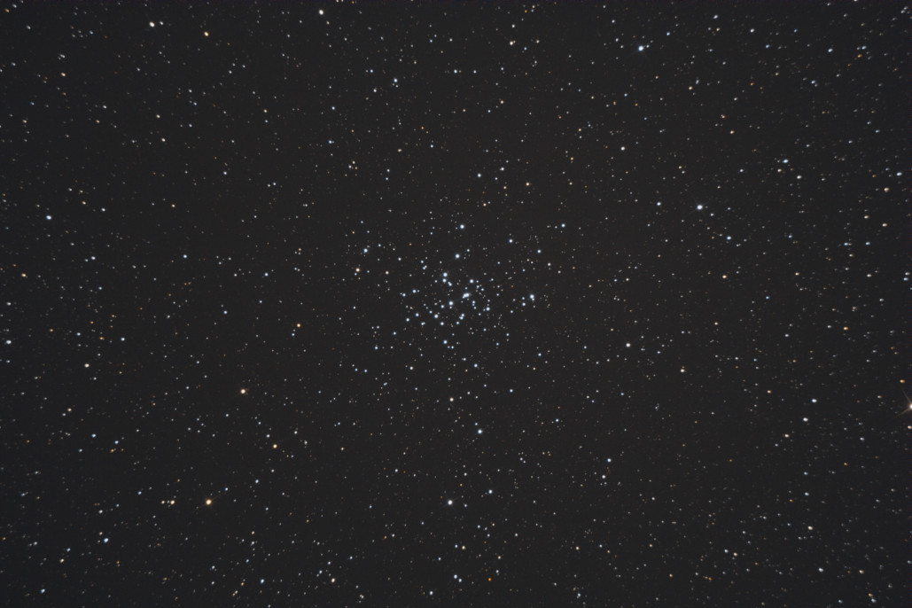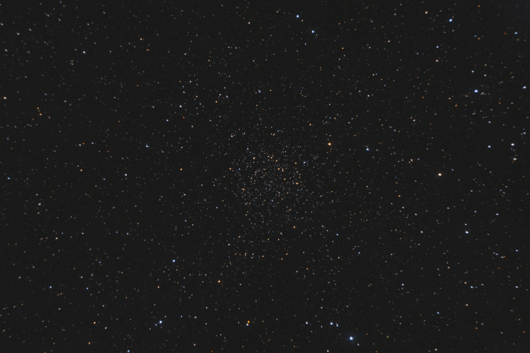 Très bel amas ouvert, pour moi le plus beau de la constellation avec M50. Ses étoiles principales dessinent trois chaînes d'étoiles qui se rejoignent au centre, la zone dense de l'amas, où trône un couple (HJ 740) présentant un joli contraste de couleur (white + bleue).