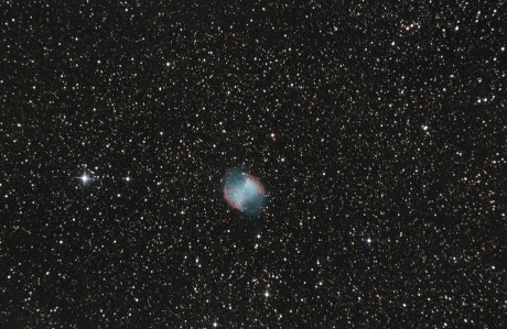 Peut-être la nébuleuse planétaire la plus facile à observer du ciel. Elle est brillante, étendue, et montre dans un 200 mm à la fois sa forme en haltère et les deux extensions sur le côté. Un filtre interférentiel, très efficace, permet de mieux voir ces extensions. L'étoile centrale est accessible sous un bon ciel.