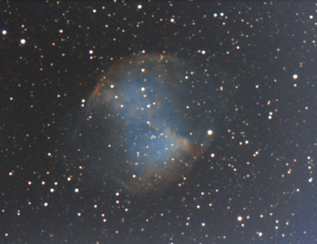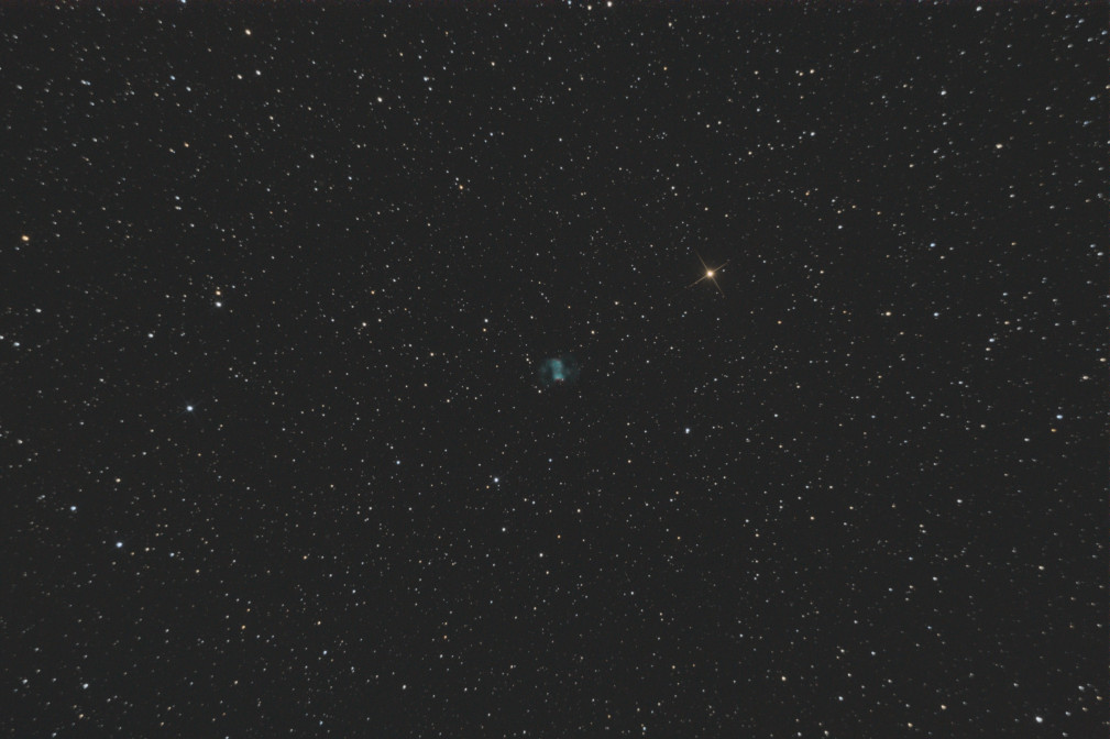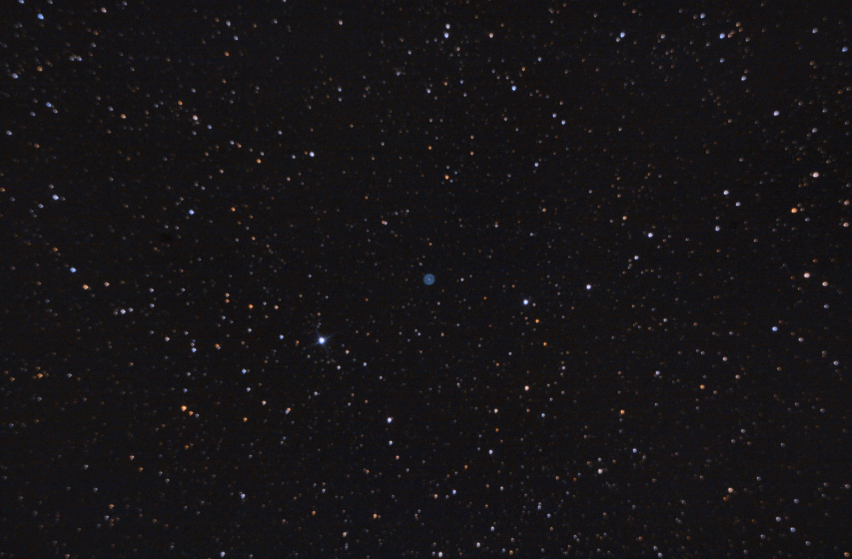 Très belle nébuleuse planétaire, ma préférée dans la constellation ! Elle a une forme particulière, allongée, avec deux lobes, l'un plus grand que l'autre. Peu de nébuleuses planétaires montrent des détails dans un télescope de 200 mm ; c'en est une.