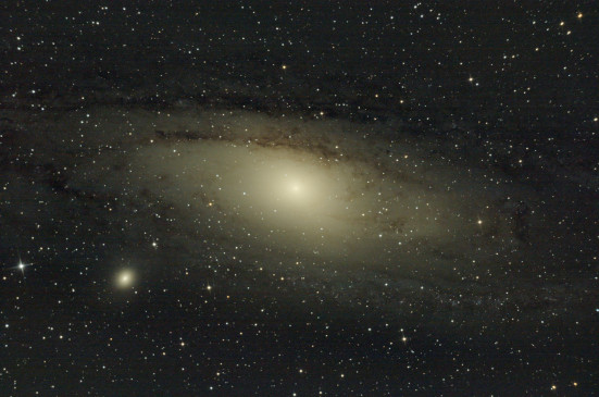 La plus grande du Groupe Local, à environ 700 kpc de notre Galaxie. Immense, bien adaptée aux jumelles. Le télescope montre au moins une bande sombre, qui délimite le bulbe et un premier bras, et éventuellement une deuxième bande sombre. Au sud-ouest, assez loin, la petite tache allongée diffuse est NGC206, un nuage stellaire de la galaxie, similaire à celui de l'Écu par exemple.