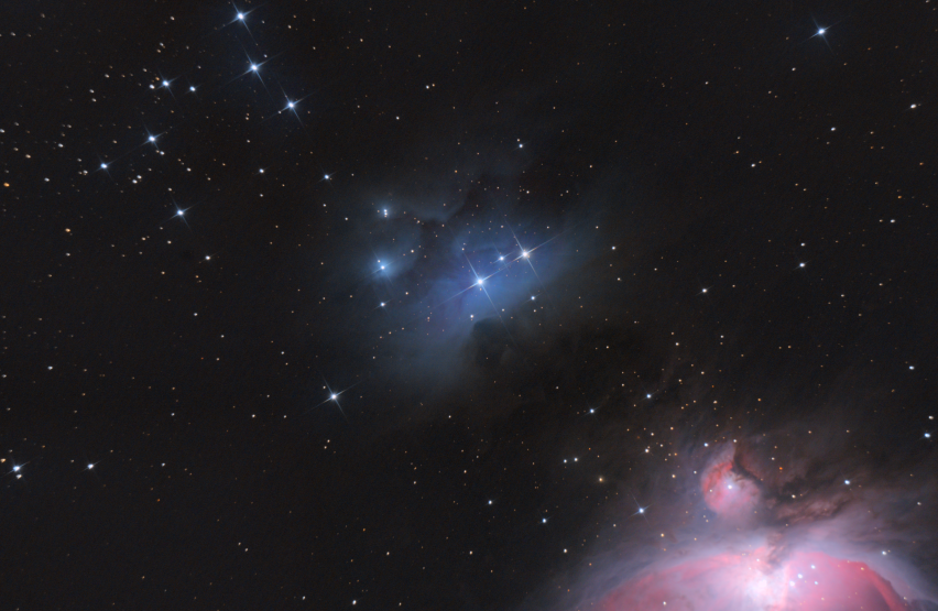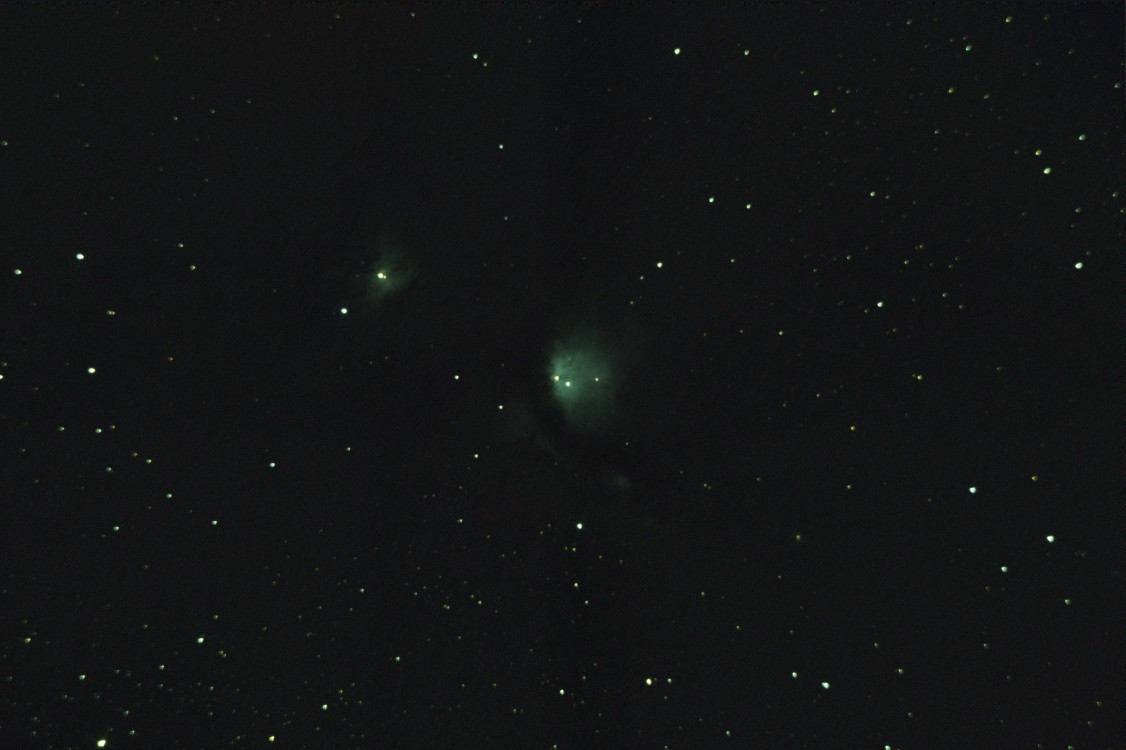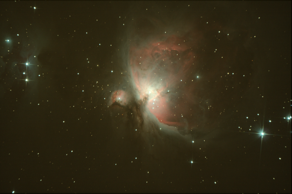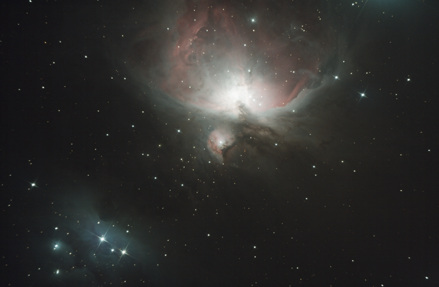 La plus belle nébuleuse du ciel ! Une région très brillante entoure le Trapèze, scupltée par l'intrusion d'une bande sombre au nord. Deux ailes se déploient à l'est ou à l'ouest. L'ensemble prend une couleur d'un vert sombre. Les détails sont bien nets, contrastés, ce qui est très inhabituel pour un objet de ce type.