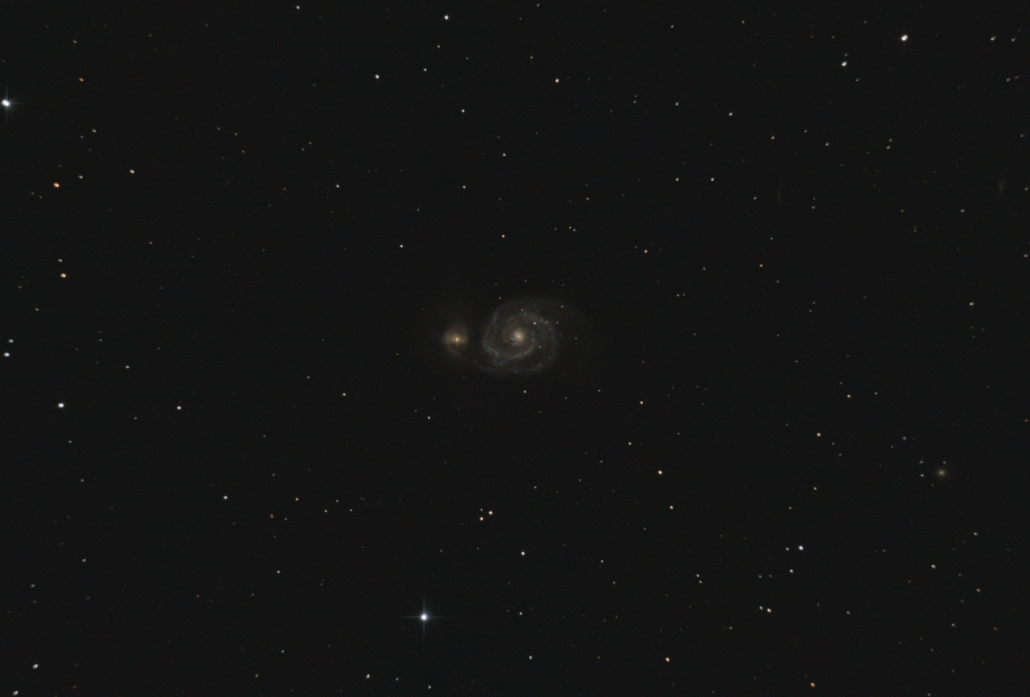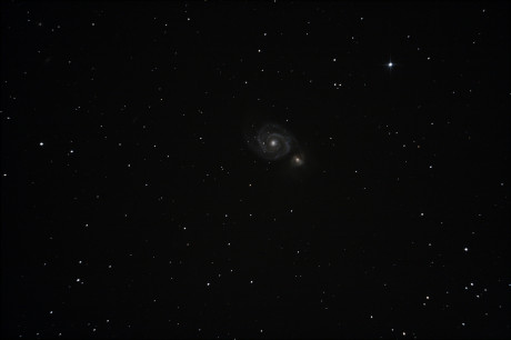La plus célèbre galaxie de la constellation est en interaction avec NGC5195. Lord Rosse a découvert visuellement sa structure spirale. Elle est à la portée d'un télescope de 300 mm sous un ciel de plaine, peut-être d'un 200 mm en haute montagne ? En plaine, on n'y détecte que l'enroulement et éventuellement des portions de bras, mais pas la structure complète (je parle pour moi en fait).