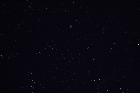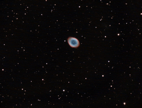 La plus célèbre des nébuleuses planétaire montre très bien son anneau, sorte de rond de fumée semblant flotter parmi les innombrables étoiles de la Voie Lactée. Des détails sont visibles, notamment l'affaiblissement des anses.